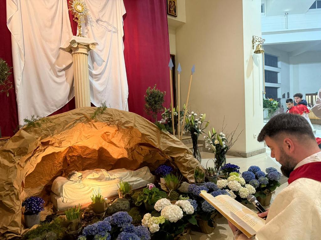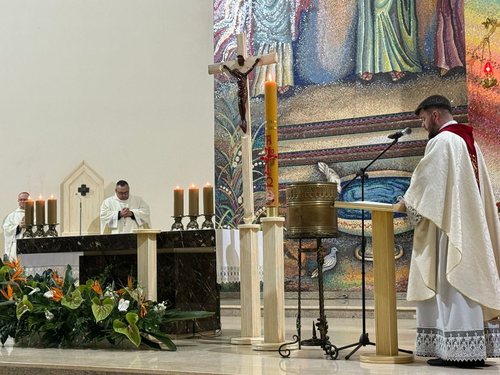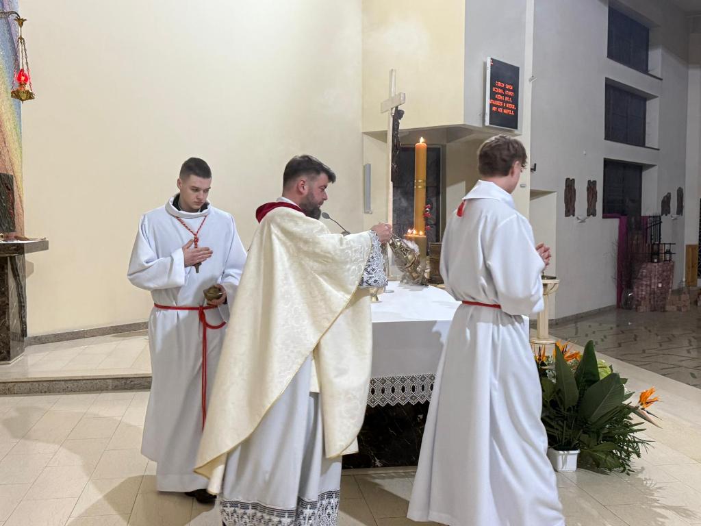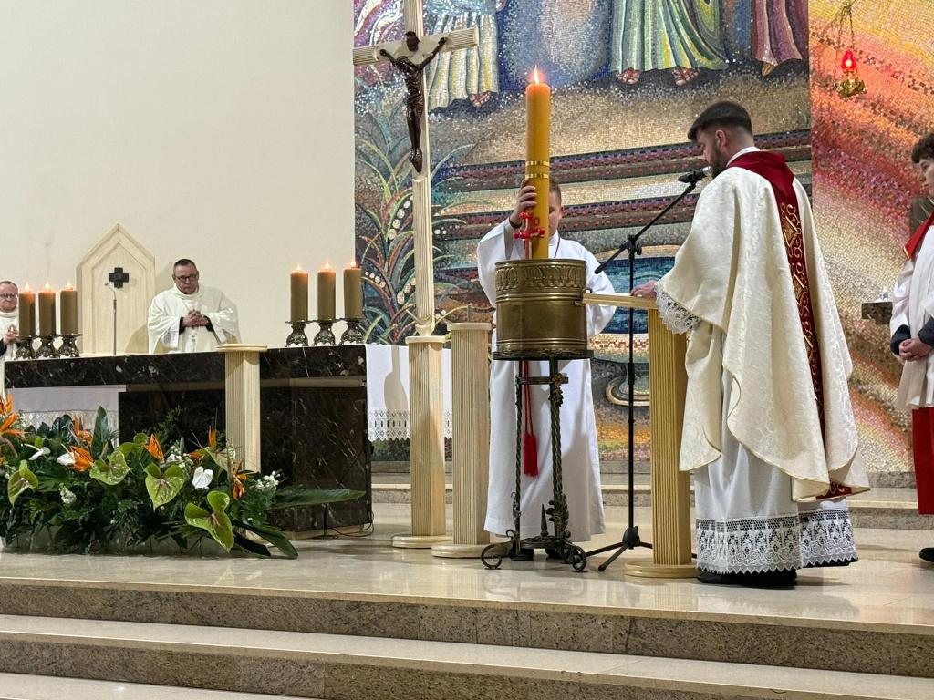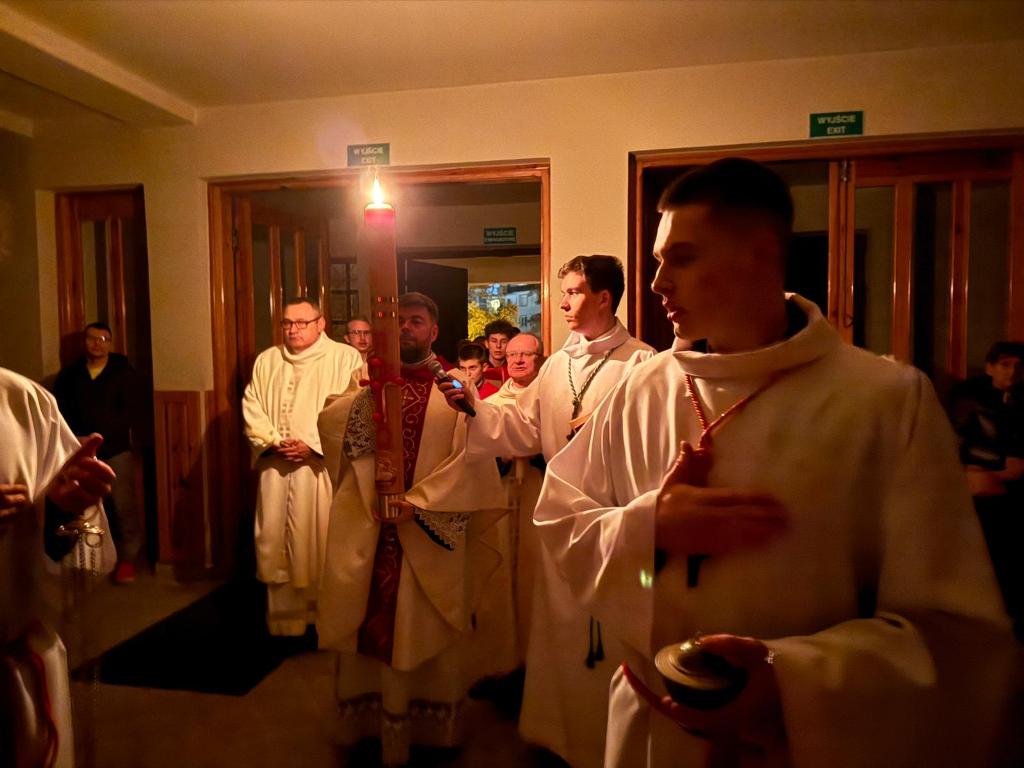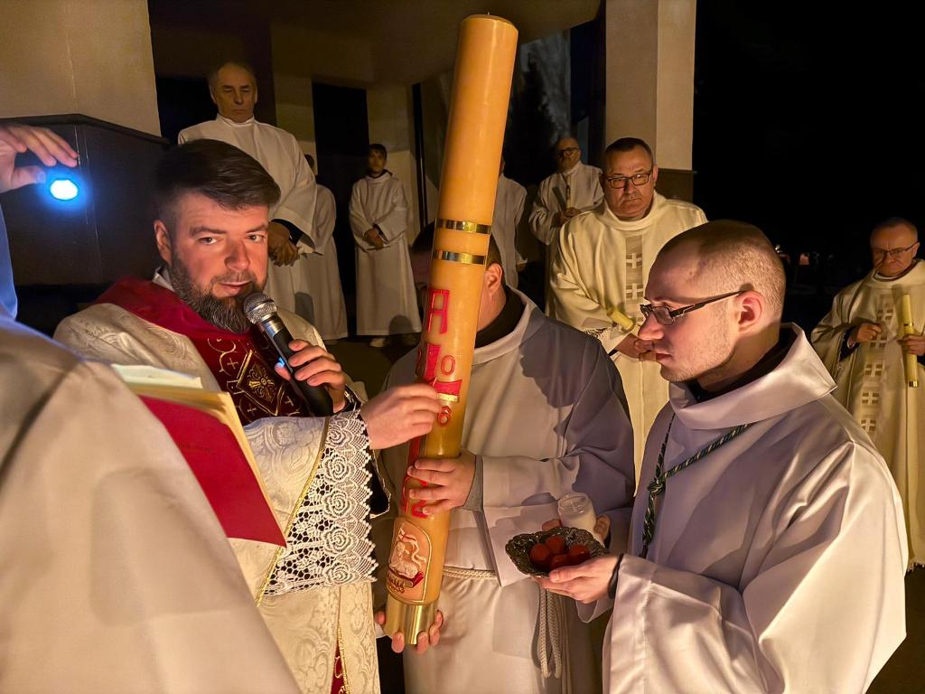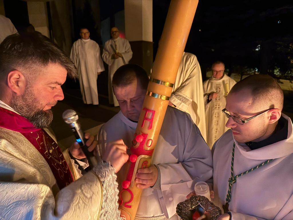 Ksiądz Piotr, który przewodniczył wieczornej liturgii poświęcił ogień, od którego później odpala się paschał. Kapłan na paschale żłobił znak krzyża, litery A (alfa) i Ω (omega) oraz liczby danego roku kalendarzowego.