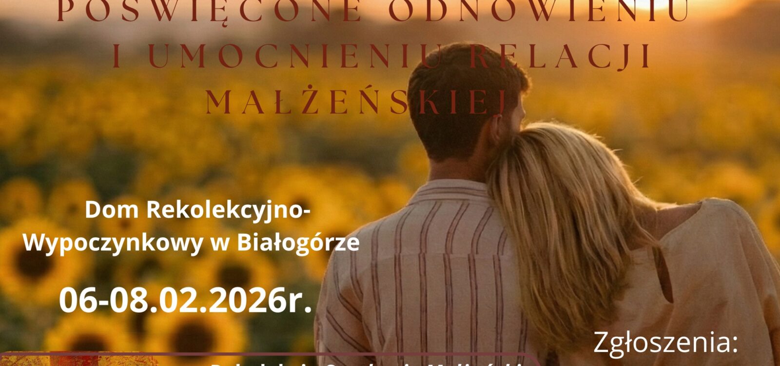 „Małżeństwa zapraszamy na rekolekcje sprzyjające wzmacnianiu więzi małżeńskiej, które odbędą się w dniach 6 – 8 lutego 2026 r. w Białogórze. Spotkania Małżeńskie zawierają warsztat dialogu małżeńskiego, w który wprowadzają uczestników pary małżeńskie oraz księża. Szczegóły i zapisy na stronie www.rodzinydiecezjipelplinskiej.pl oraz na plakacie”.