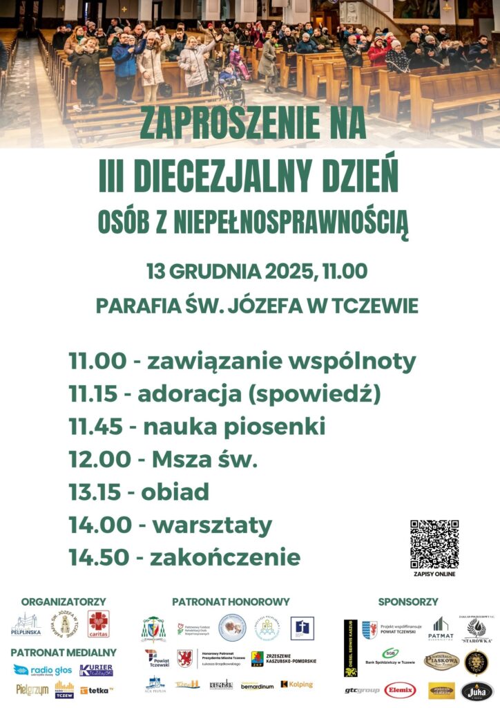 W sobotę 13 grudnia o godz. 11.00 w parafii św. Józefa w Tczewie odbędzie się III Diecezjalny Dzień Osób z Niepełnosprawnością pod hasłem Umiłowałem cię. Zapraszamy osoby z niepełnosprawnościami,