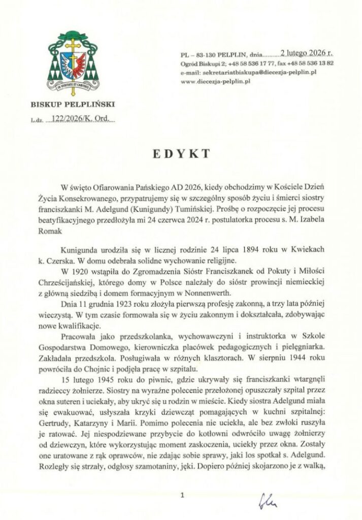 W święto Ofiarowania Pańskiego, 2 lutego 2026 r., Biskup Pelpliński ogłosił zamiar rozpoczęcia procesu beatyfikacyjnego siostry Marii Adelgund (Kunigundy) Tumińskiej. Franciszkanka poniosła śmierć męczeńską w 1945 roku w Chojnicach, oddając życie w obronie kobiet przed żołnierzami Armii Czerwonej.
