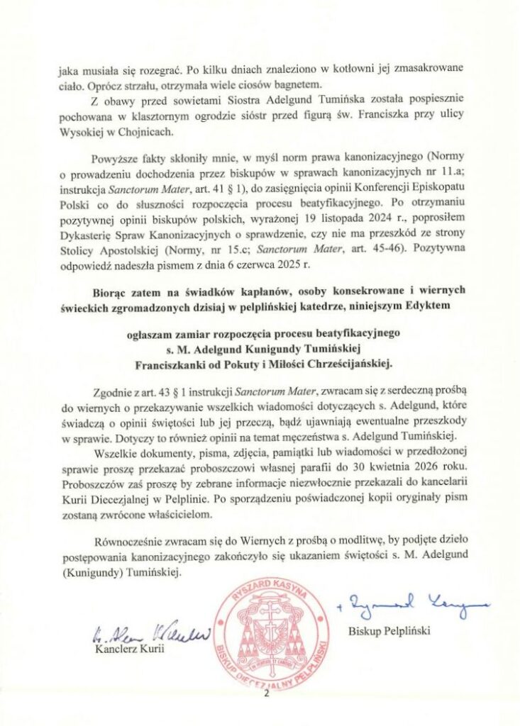 „Zwracam się z serdeczną prośbą do wiernych o przekazywanie wszelkich wiadomości dotyczących s. Adelgund, które świadczą o opinii świętości lub jej przeczą, bądź ujawniają ewentualne przeszkody w sprawie” – napisał w Edykcie Biskup Pelpliński.