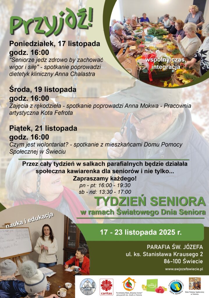 W piątek 14 listopada przypada Ogólnopolski Dzień Seniora. W ramach tego dnia przez cały tydzień od 17 do 23 listopada zapraszamy seniorów naszej parafii by wspólnie spędzić Tydzień Seniora. Spotkania odbędą się 17, 19 i 21 listopada w godz. od. 16:00. W poniedziałek będzie spotkanie pt. „Seniorze jedz zdrowo, by zachować siłę i wigor”, które poprowadzi Anna Chalastra – dietetyk kliniczny. W środę zajęcia z rękodzieła, które poprowadzi Anna Mokwa z Pracowni Kota Fefrota, natomiast w piątek odwiedzimy Dom Pomocy Społecznej w Świeciu i dowiemy się  „Czym jest wolontariat?”.